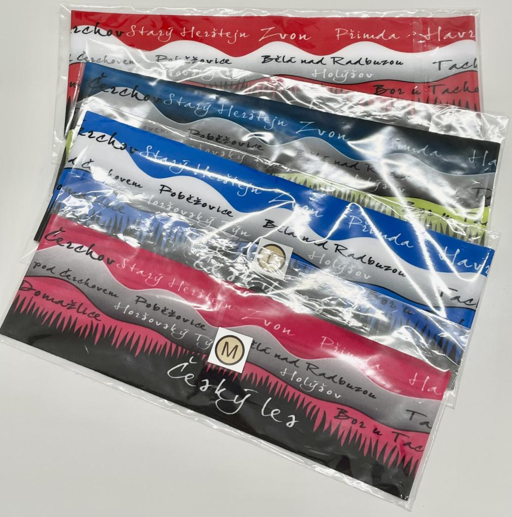 Tenká čelenka - destinace Český les s názvy měst a vrcholů Českého lesa.