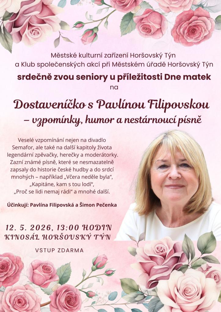 Posezení pro seniory u příležitosti Dne matek s Pavlínou Filipovskou. Na programu vzpomínky, humor a nestárnoucí písně. Od 13:00 hodin v kinosále Horšovský Týn.