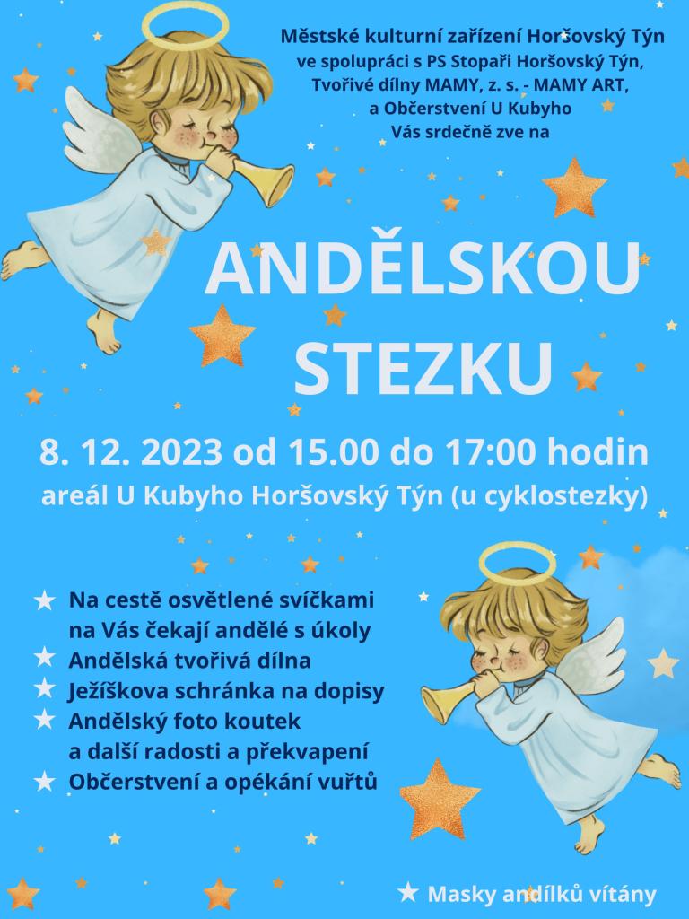 Doslova slet andělů se konal 8. prosince v areálu U Kubyho. Jejich hlavním úkolem bylo připravit dětem Andělskou stezku, na které děti plnily úkoly, vyráběly, smály se i trošku bály, získávaly dárečky, ale hlavně si to pohádkově užily. Společně všichni vytvořili báječnou andělskou atmosféru.