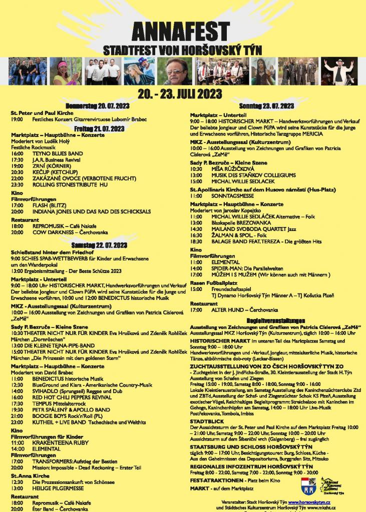 ANENSKÁ POUŤ - SLAVNOSTI MĚSTA HORŠOVSKÝ TÝN 20. - 23. ČERVENCE 2023 multižánrový hudební program, historický jarmark, divadlo pro děti, filmová představení, střelecká soutěž, pouťové atrakce a další doprovodný program.