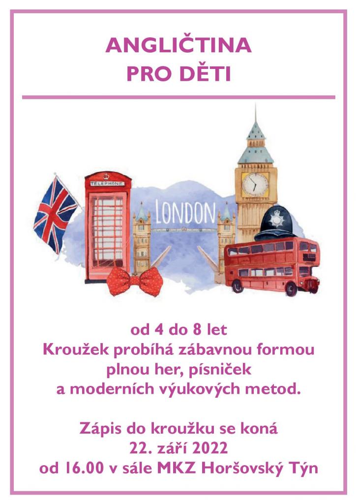 Zápis do kroužku Angličtiny pro děti od 4 do 8 let proběhne od 16:00 hodin v sále MKZ Horšovský Týn.