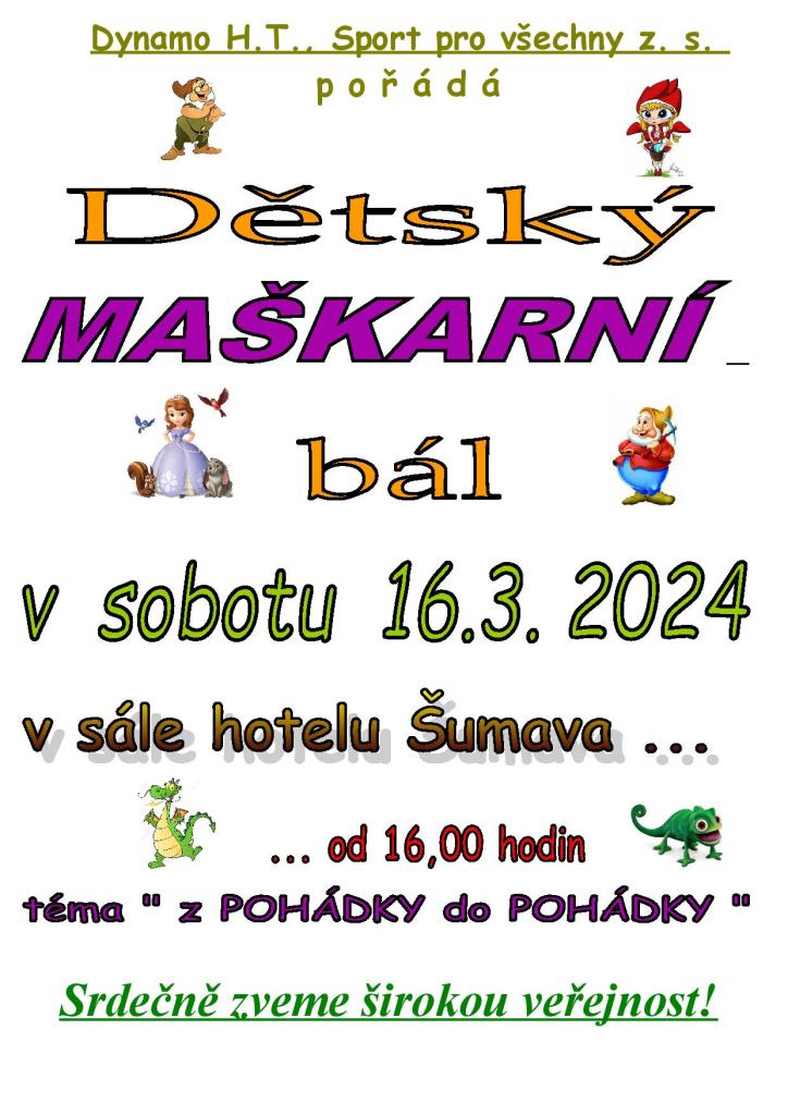 Dynamo H.T..Sport pro všechny z. s. pořádá Dětský maškarní bál v sobotu 16. 3. 2024 od 16:00 hodin v sále Šumava Horšovský Týn.