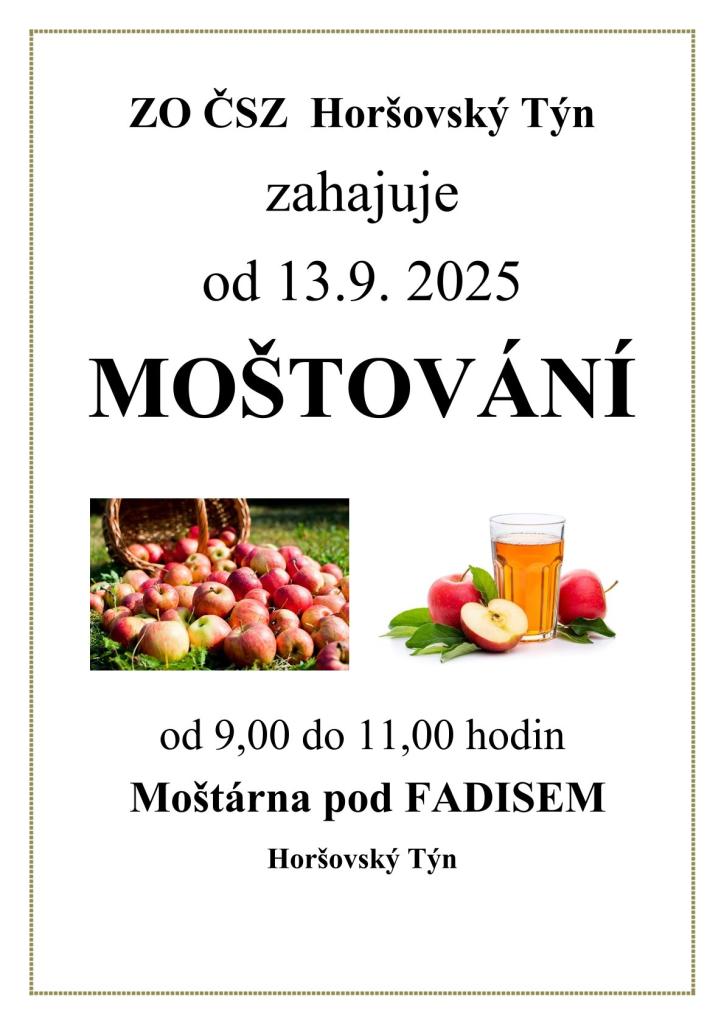 ZO ČSZ Horšovský Týn zahajuje od 13. 9. 2025 MOŠTOVÁNÍ každou sobotu od 9:00 do 11:00 hodin. Moštárna pod FADISEM Horšovský Týn