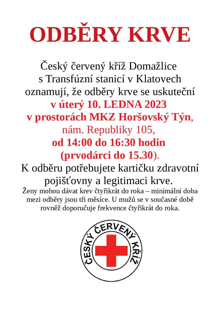 Český červený kříž v Domažlicích s Transfúzní stanicí v Klatovech pořádají v prostorách MKZ Horšovský Týn odběry krve.