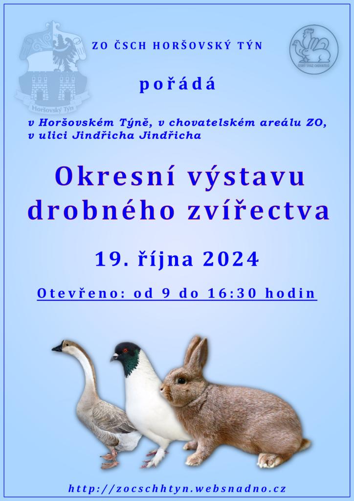 ZO ČSCH Horšovský Týn pořádá v Horšovském Týně, v chovatelském areálu ZO, v ulici J. Jindřicha Okresní výstavu drobného zvířectva. Otevřeno od 9:00 do 16:30 hodin.
