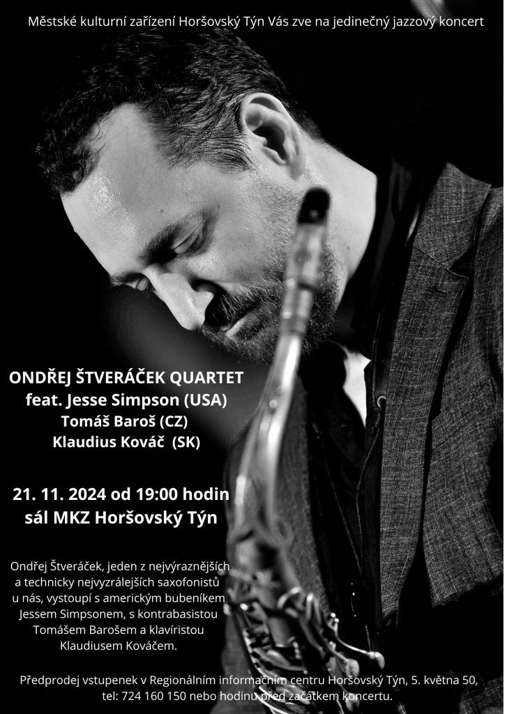 Městské kulturní zařízení Vás zve na jedinečný jazzový koncert ONDŘEJ ŠTVERÁČEK QUARTET feat. Jesse Simpson (USA(, Tomás Baruš (CZ), Klaudius Kováč (SK) 21. 11. od 19:00 hodin.