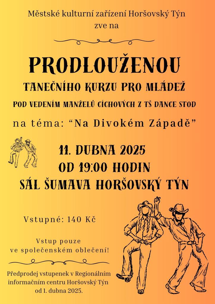 Prodloužená tanečního kurzu pro mládež na téma: "Na Divokém Západě" 11. dubna 2025 od 19:00 hodin, sál Šumava Horšovský Týn.