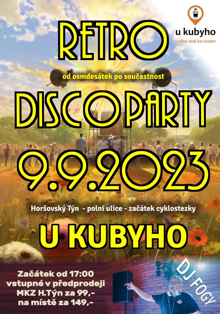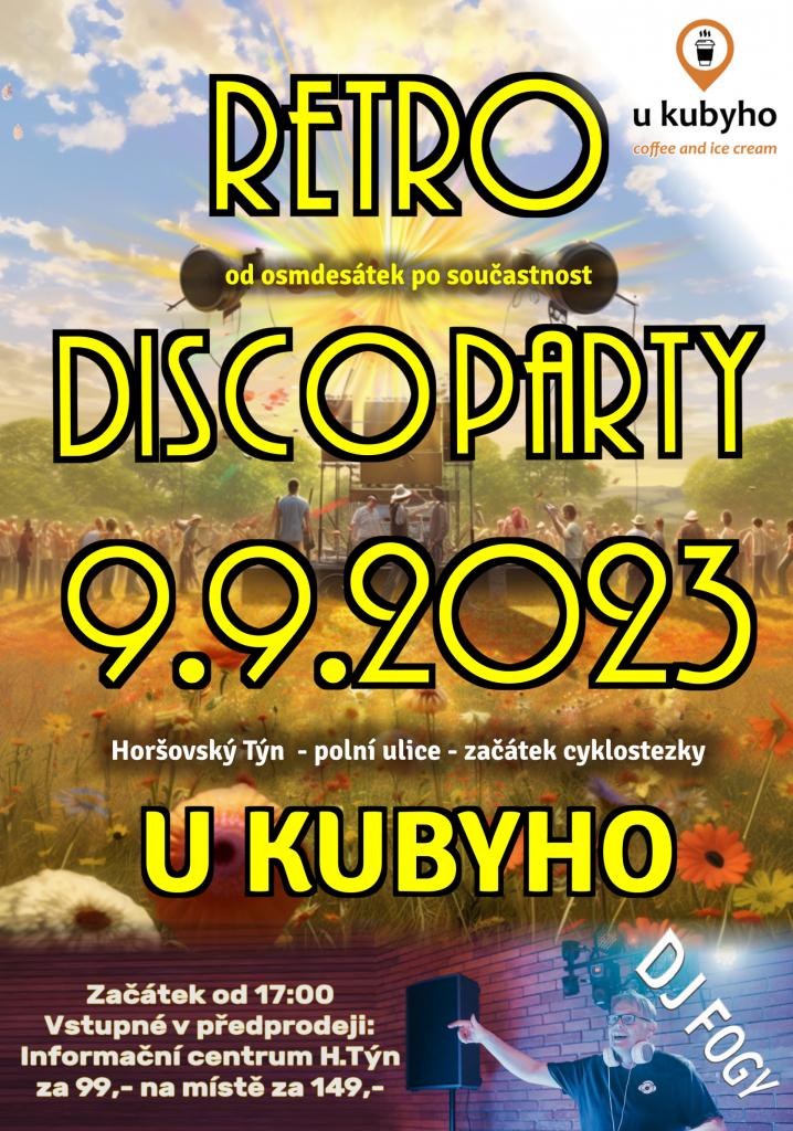 RETRO DISCO PÁRTY U KUBYHO 9. září 2023 od 17:00 hodin, Horšovský Týn, Polní ulice, začátek cyklostezky. Předprodej vstupenek v Regionálním informačním centru Horšovský Týn, nám. Republiky 11, tel.: 724 160 150.