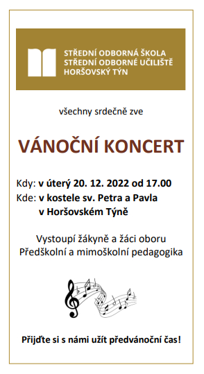 Střední odborná škola a střední odborné učiliště Horšovský Týn všechny srdečně zve na VÁNOČNÍ KONCERT, který se koná v úterý 20. prosince 2022 v kostele sv. Petra a Pavla.