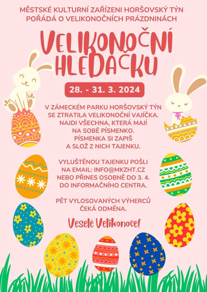 MKZ Horšovský Týn pořádá o velikonočních prázdninách VELIKONOČNÍ HLEDAČKU. V zámeckém parku Horšovský Týn se ztratila velikonoční vajíčka. Najdi všechna, která mají na sobě písmenko a zapiš si ho. Z písmenek složíš tajenku. Veselé velikonoce.