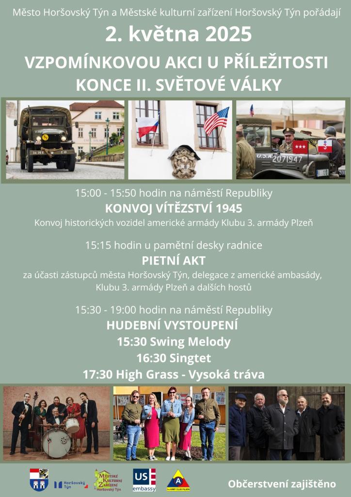Město Horšovský Týn a Městské kulturní zařízení Horšovský Týn pořádá 2. května 2025 VZPOMÍNKOVOU AKCI U PŘÍLEŽITOSTI KONCE II. SVĚTOVÉ VÁLKY od 15:00 hodin, náměstí Republiky