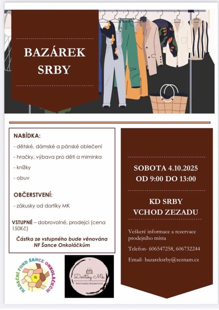 Bazárek Srby 4. 10. 2025 od 9:00 hodin v kulturním domě v Srbech, vchod zezadu.