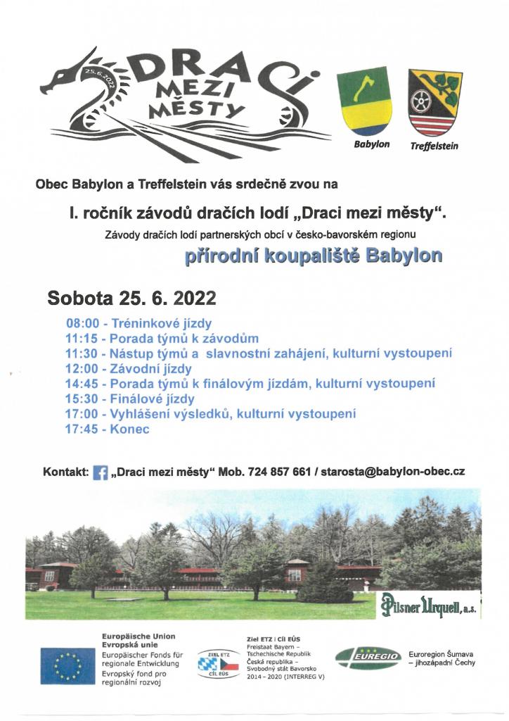 Obec Babylon a Treffelstein Vás srdečně zvou na závody dračích lodí partnerských obcí v česko-bavorském regionu. Přírodní koupaliště Babylon, sobota 25. 6. 2022.